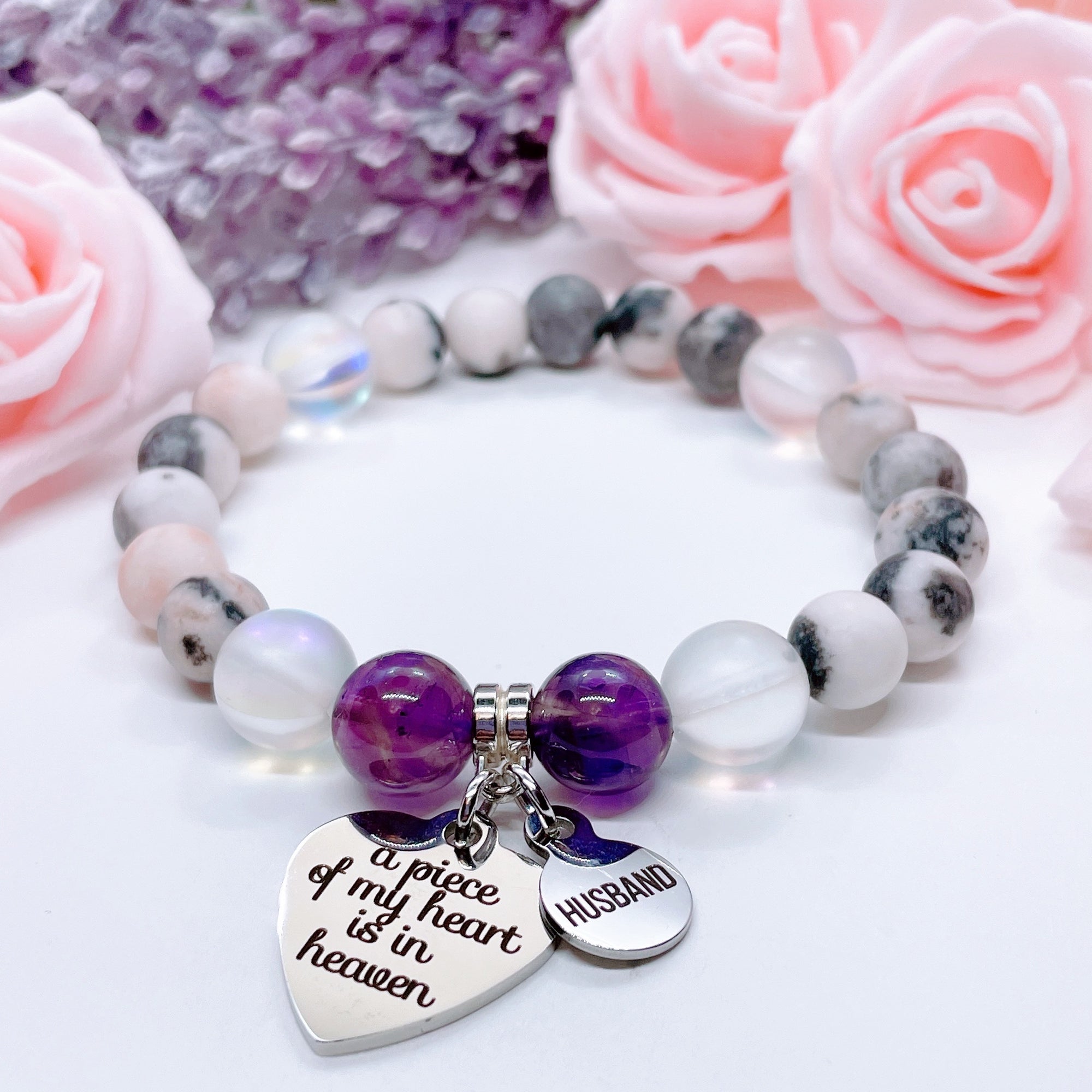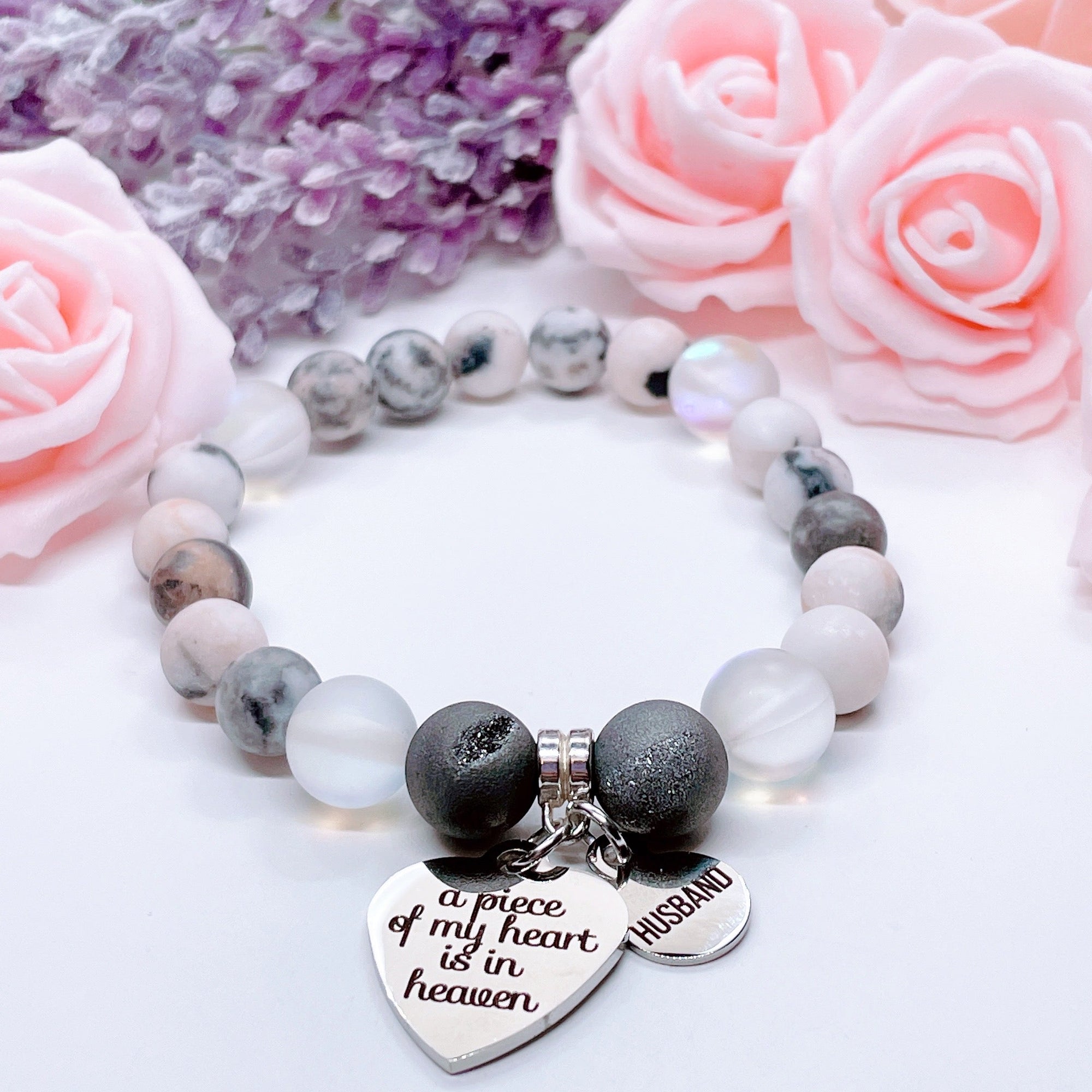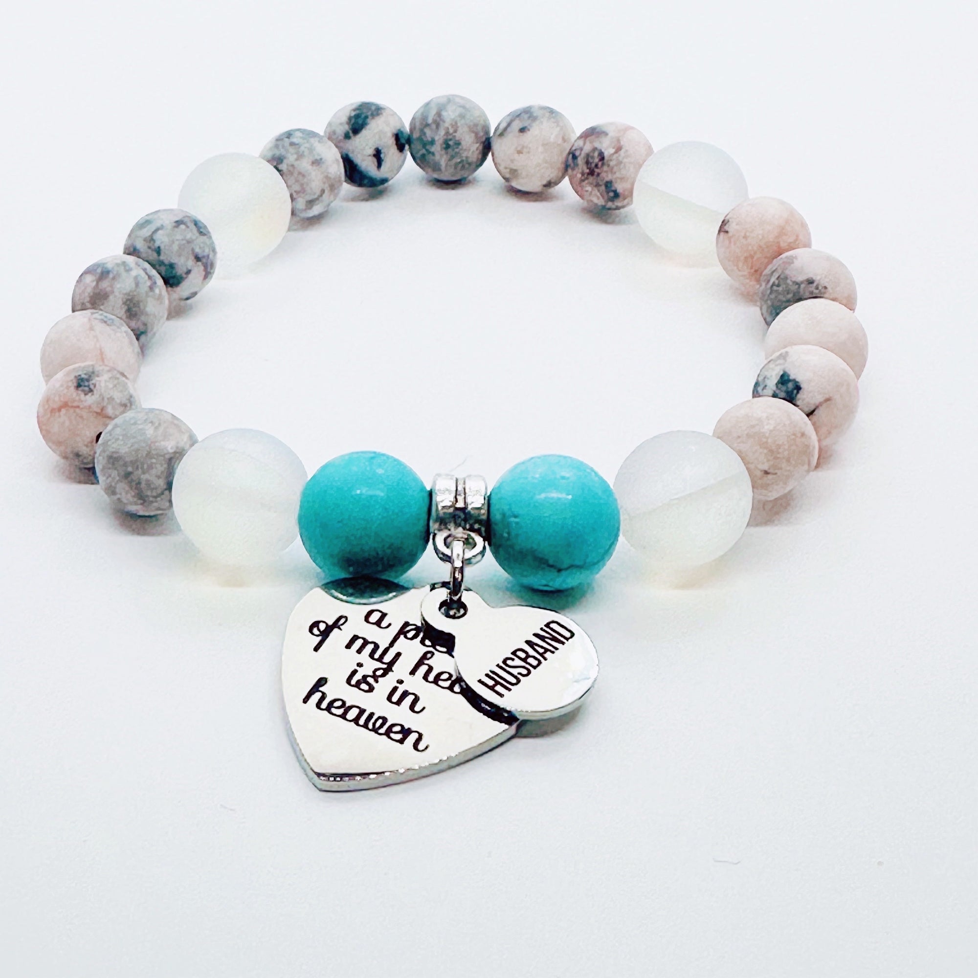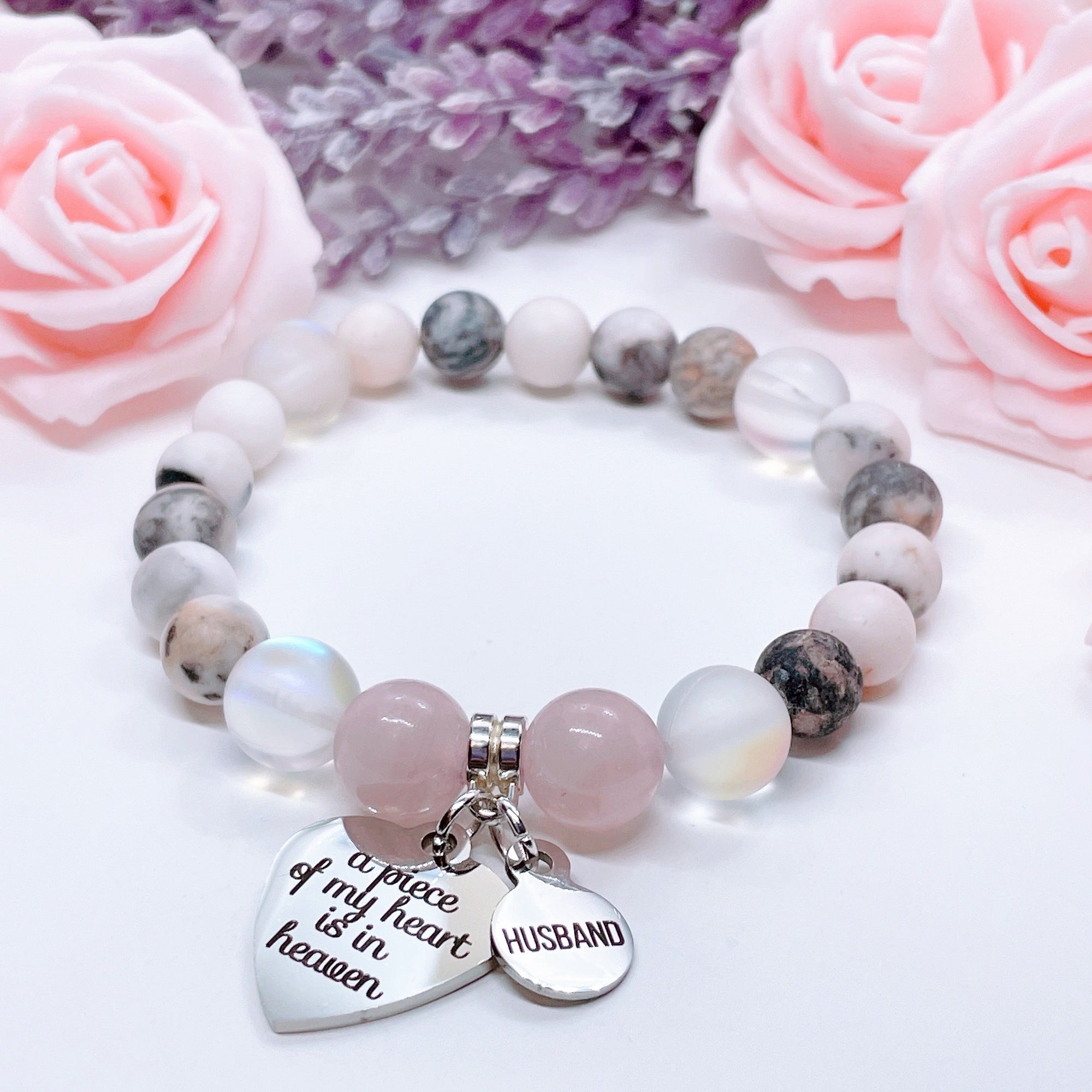 Husband: A Piece of my Heart is in Heaven Heart Classic Charm Bracelet Rose Quartz