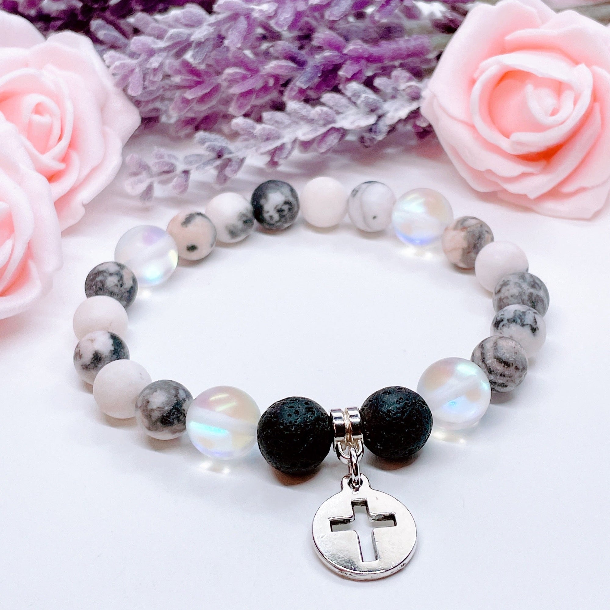 Silver Hollow Cross Classic Charm Bracelet Amethyst