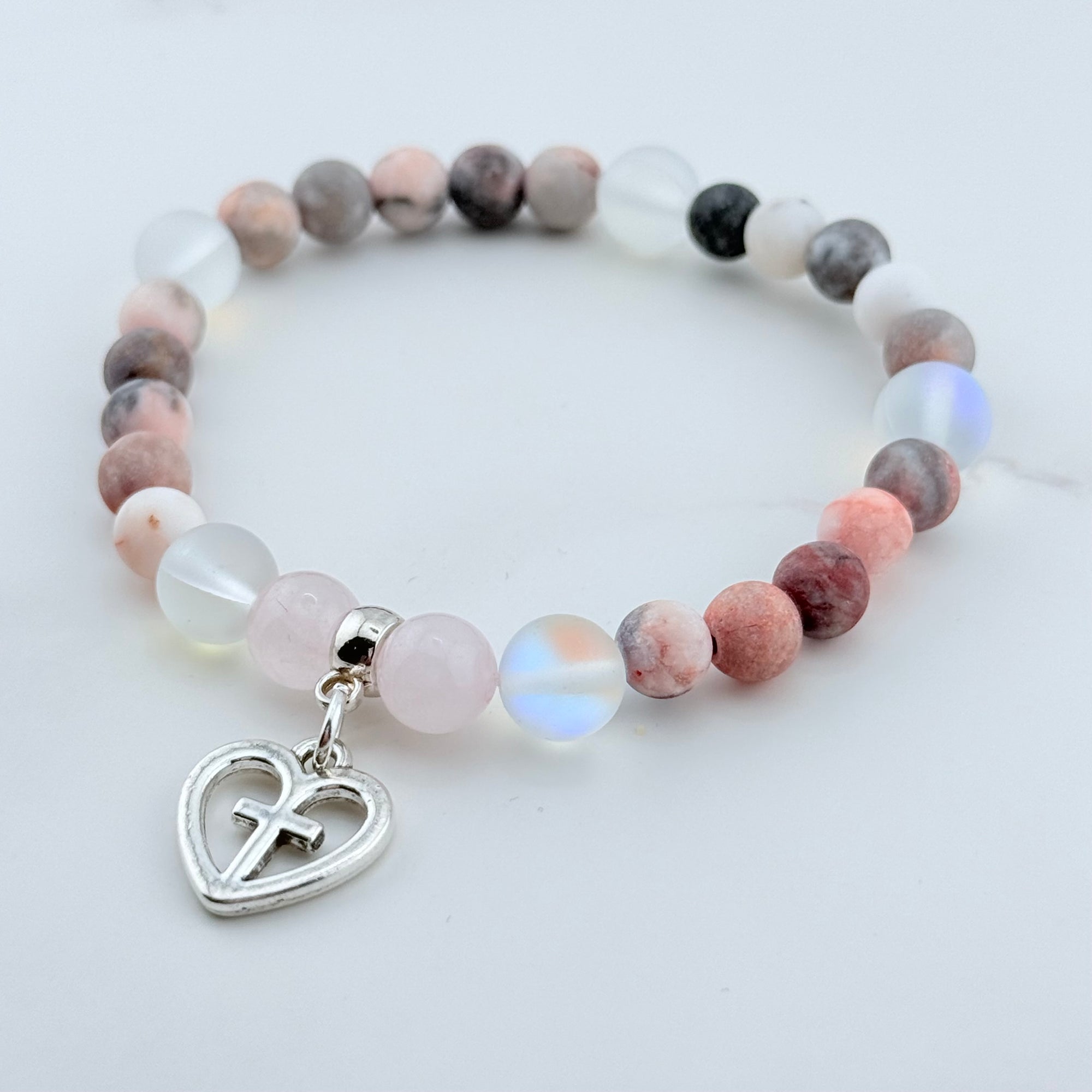 Heart Hollow Cross Companion Charm Bracelet Rose Quartz