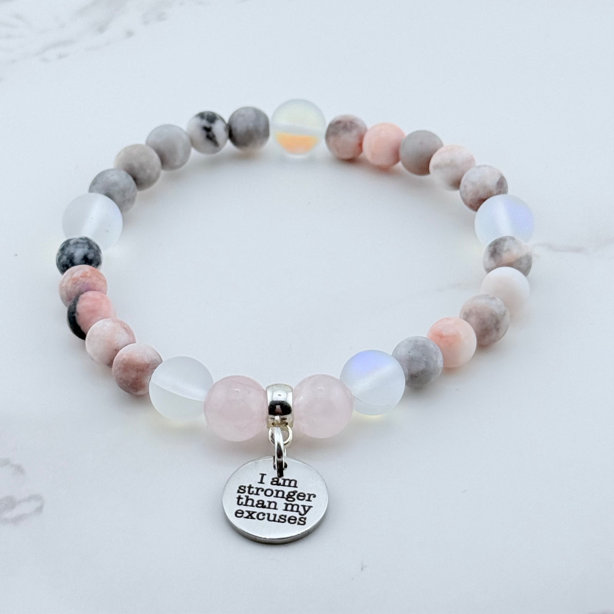 I am Stronger than My Excuses Companion Charm Bracelet Bracelet Rose Quartz